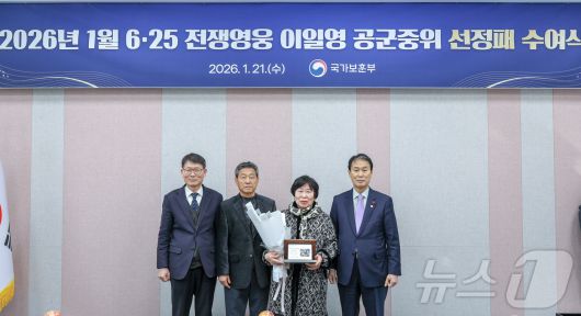 (서울=뉴스1) = 권오을 국가보훈부 장관이 21일 오후 경북 예천군 정부경북지방합동청사에서 열린 2026년 1월 6.25전쟁영웅 선정패 수여식에 참석해 故 이일영 공군 준위 유가족 이춘영 씨에게 선정패를 전달하고 있다. (국가보훈부 제공. 재판매 및 DB 금지) 2026.1.21/뉴스1
