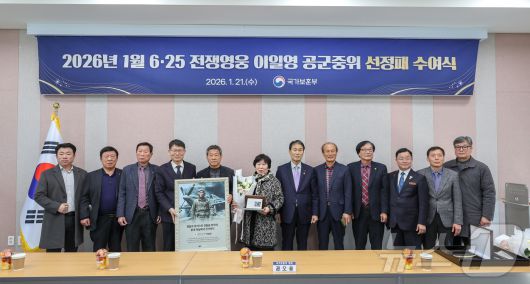 (서울=뉴스1) = 권오을 국가보훈부 장관이 21일 오후 경북 예천군 정부경북지방합동청사에서 열린 2026년 1월 6.25전쟁영웅 선정패 수여식에 참석해 故 이일영 공군 준위 유가족 이춘영 씨 와 강일호 이일영기념사업회 이사장 및 주요내빈들과 함께 기념촬영을 하고 있다. (국가보훈부 제공. 재판매 및 DB 금지) 2026.1.21/뉴스1