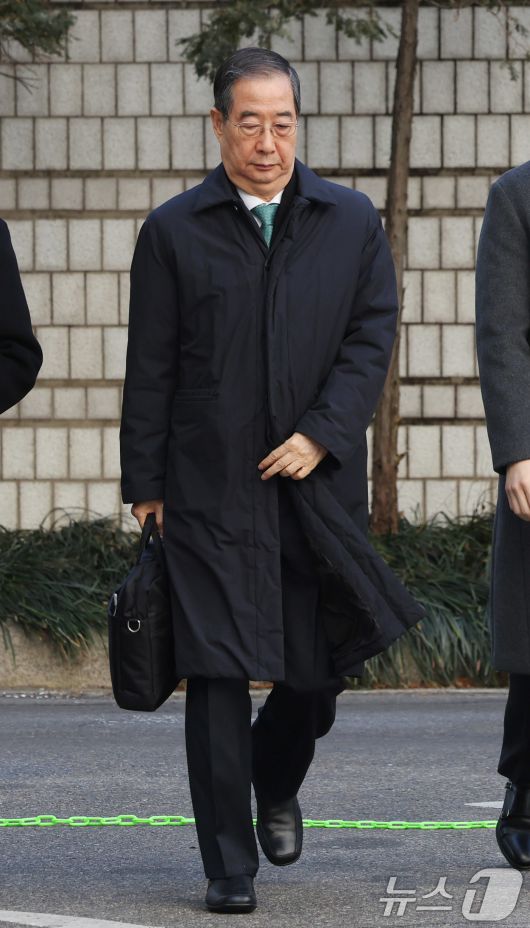 (서울=뉴스1) 박지혜 기자 = 한덕수 전 국무총리가 21일 오후 서울 서초구 서울중앙지법에서 열린 내란 우두머리 방조, 내란 중요임무 종사 혐의 사건 1심 선고공판에 출석하고 있다. 이날 내란 중요임무 종사 혐의로 기소된 한 전 총리는 1심에서 징역 23년을 선고받고 법정구속됐다. 2026.1.21/뉴스1