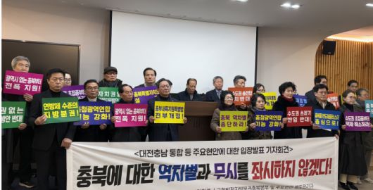 [청주=뉴스핌] 백운학 기자 =균형발전지방분권충북본부 등 충북 8개 시민단체는 21일 충북도청 브리핑룸에서 기자회견을 열고 정부와 여당이 추진 중인 대전·충남 행정통합을 비롯한 수도권 중심 정책에 강력한 반대 입장을 밝혔다.