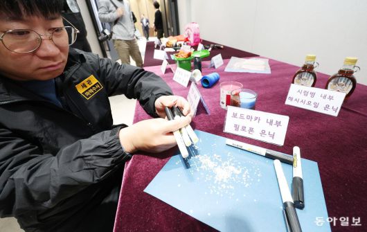 펜의 심을 버리고 가루형 마약을 채우는 수법입니다. 기자회견장에서 공개한 저 흰 가루는 실제 마약은 아니고요, 이해를 돕기 위한 재료입니다. 주로 소금이나 밀가루를 씁니다. |