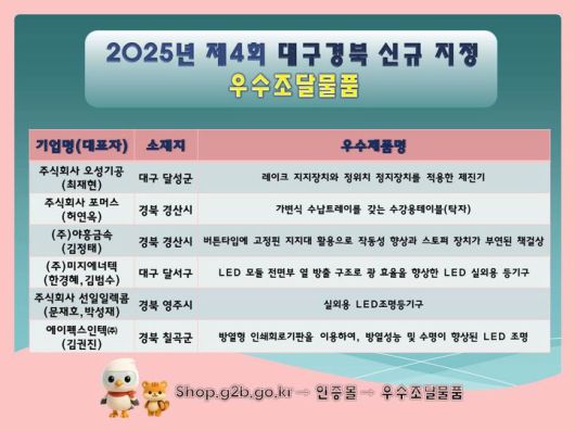 [대구=뉴시스] 김정화 기자 = 대구지방조달청은 대구·경북 지역 6개 기업의 제품이 2025년 제4회 우수조달물품으로 지정됐다고 21일 밝혔다.