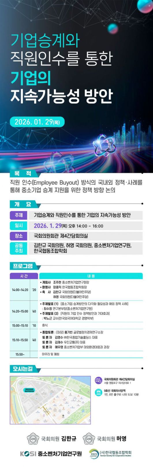 이번 세미나는 중기연, 한국협동조합학회, 국회의원 김한규·허영 의원이 공동 개최하는 행사로 국내 중소기업의 원활한 기업승계와 고용 안정을 위해 직원 인수 제도의 역할과 가능성을 집중 조명할 예정이다.