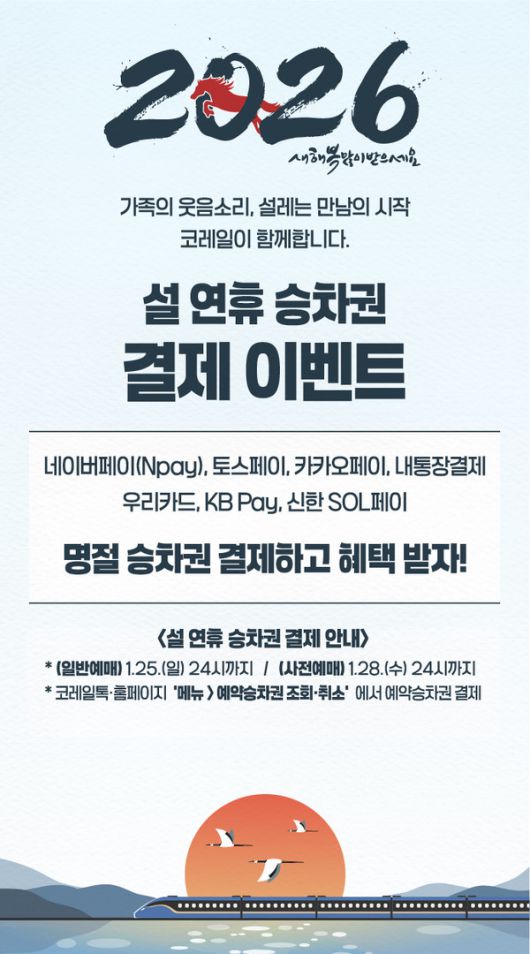 코레일은 설 연휴 승차권 예매 고객에게 감사하는 마음을 전하고자 2억원 상당의 페이백·할인 이벤트를 진행합니다.