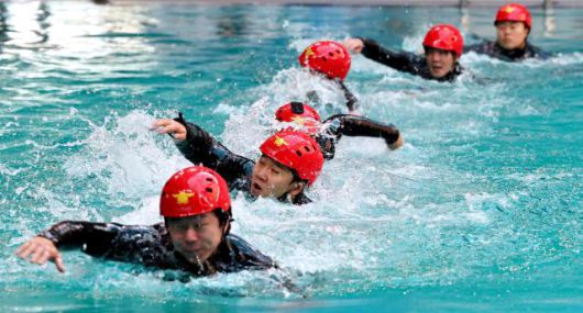 Rescue team members from Incheon Bupyeong Fire Station conduct winter water rescue training at the diving pool of Munhak Park Tae-hwan Swimming Pool in Michuhol-gu, Incheon, on Jan. 21. |