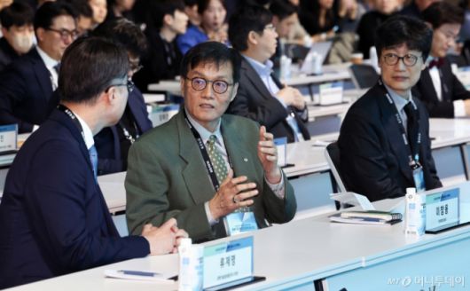이창용 한국은행 총재가 21일 오후 서울 중구 한국은행에서 열린 한국은행·네이버 공동 AX(인공지능 전환) 컨퍼런스에서 류제명 과학기술정보통신부 2차관과 대화를 나누고 있다. 오른쪽은 이해진 네이버 이사회 의장. 2026.1.21. /사진=(서울=뉴스1) 최지환 기자 |