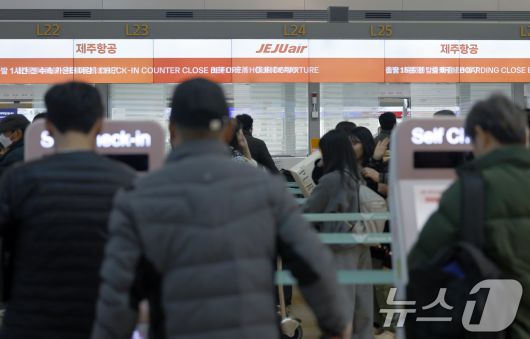 (인천공항=뉴스1) 박정호 기자 = 제주항공이 리튬이온 배터리로 인한 화재를 예방하기 위해 항공기 기내에 반입하는 보조배터리의 사용 전면 금지를 밝힌 21일 인천국제공항 1터미널 제주항공 체크인카운터에서 고객들이 순서를 기다리고 있다. 제주항공은 오는 22일부터 모든 국내·국제선에서 보조배터리를 사용해 휴대전화나 태블릿 PC 등 전자기기를 충전할 수 없다고 밝혔다. 2026.1.21/뉴스1