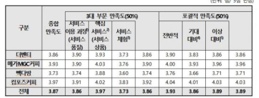 종합만족도는 평균 3.87점(5점 만점)이었다. 1위는 컴포즈커피로 3.97점을 기록했다. 한국소비자원 자료를 분석하면 컴포즈커피는 고객 응대, 운영 전문성, 고객 공감, 메뉴 품질, 주문·결제·이용 편의성, 취소·변경·환불 부문에서 4사 중 가장 높은 점수를 기록했다.