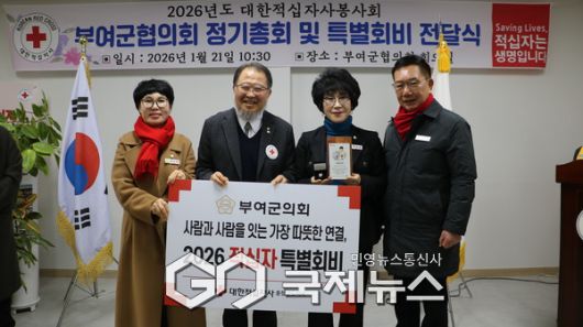 (부여=국제뉴스) 박의규 기자 = 부여군의회(의장 김영춘)는 21일 대한적십자사봉사회 부여군협의회 정기총회에서 2026년도 대한적십자사 특별회비 전달식을 가졌다.