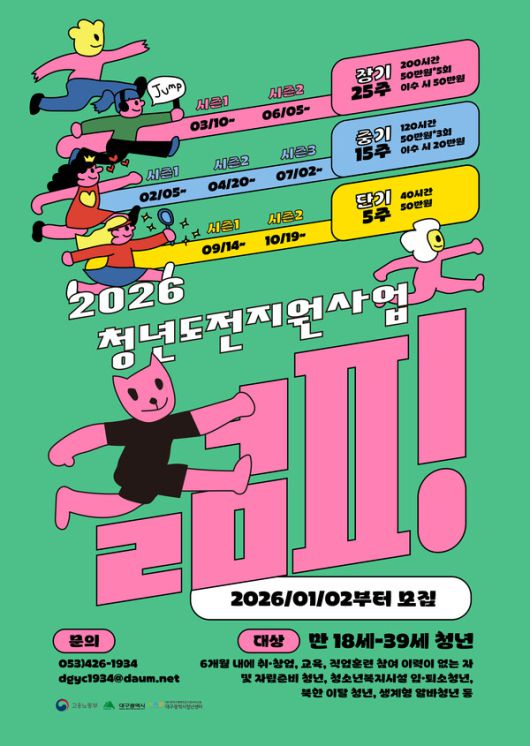 박윤희 대구시 청년여성교육국장은 "청년도전지원사업은 취업 과정에서 잠시 멈춰 선 청년들이 다시 자신감을 찾고 재도전에 나설 수 있도록 돕는 맞춤형 지원 정책"이라며 "지역 청년들의 많은 관심과 참여를 부탁드린다"고 말했다.