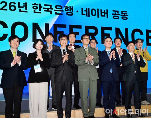 아시아투데이 박상선 기자 = 이창용 한국은행 총재와 이해진 네이버 창업자 겸 이사회 의장이 21일 서울 중구 한국은행 별관에서 열린 2026 한국은행-네이버 공동 AX 컨퍼런스에서 주요 인사들과 기념 촬영을 하고 있다. (사진 앞줄 왼쪽 두번째부터 최수연 네이버 대표, 이해진 의장, 이창용 총재, 류제명 한국과학기술정보통신부 제2차관) ⓒ "젊은 파워, 모바일 넘버원 아시아투데이"