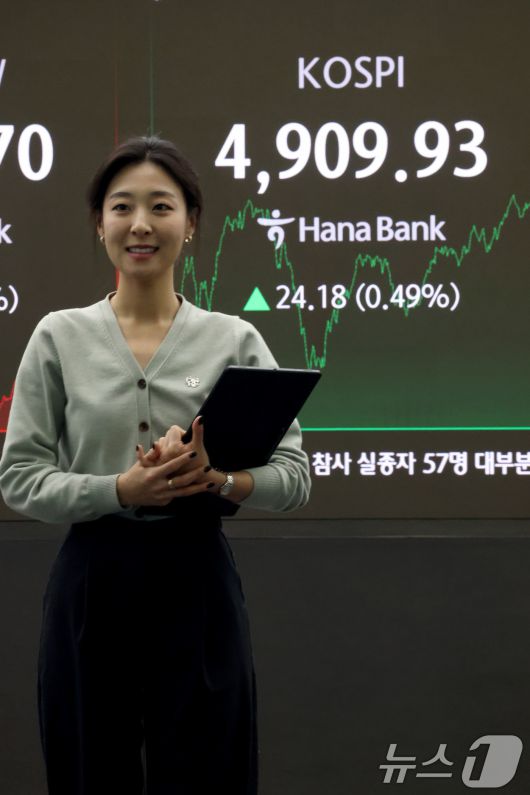 (서울=뉴스1) 이광호 기자 = 코스피가 장중 등락을 반복하다 4900대에서 장을 마감한 21일 오후 서울 중구 하나은행 본점 딜링룸 현황판에 코스피 지수가 전장 대비 24.18포인트(0.49%) 상승한 4,909.03을 나타내고 있다. 2026.1.21/뉴스1