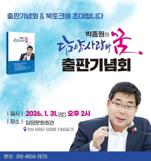 박 의원은 "이번 출판기념회가 책을 통해 담양의 미래에 대해 공감하는 시간이 되길 바란다"며 "편안한 분위기 속에서 자유롭게 참석해 주시길 바란다"고 말했다.