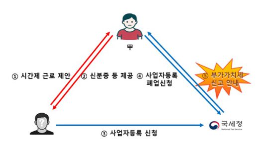 또 근로계약서 작성을 미끼로 신분증을 요구한뒤 사업자등록을 하면 사업장에서 매출이 발생하고 세무서로부터 부가가치세 신고안내까지 받게 된다.