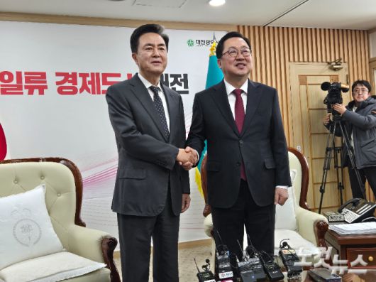 이장우 대전시장과 김태흠 충남지사가 21일 대전시청 접견실에서 만나 악수하고 있다. 고형석 기자 |