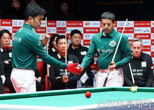 [고양(경기)=스포츠투데이 팽현준 기자] 21일 경기도 고양 킨텍스 PBA스타디움에서 열린 '웰컴저축은행 PBA 팀리그 2025-2026' 하나카드와 SK렌터카의 챔피언결정전 5차전, 득점한 하나카드 응우옌꾸옥응우옌과 초클루가 손을 맞대고 있다. 2026.01.21. [스포츠투데이 팽현준 기자 sports@stoo.com]