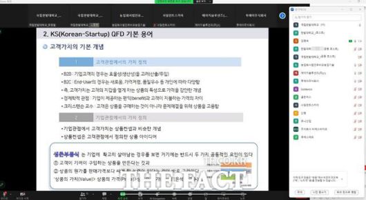 국립한밭대 창업지원단이 초기창업기업의 제품·기술 경쟁력 강화를 위해 진행한 제품 개선·검증 프로그램 온라인 강의 운영 화면. /한밭대 |