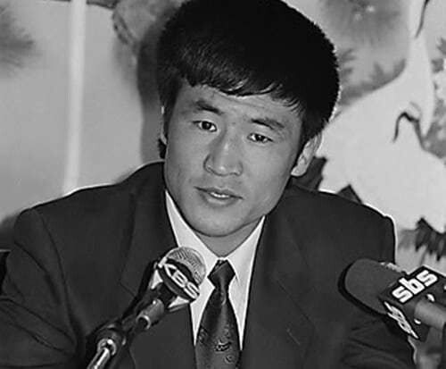 이창수 전 유도 대표팀 코치가 1991년 한국 귀순 이후 기자회견 하는 모습. 연합뉴스 |