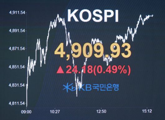 이날 한국거래소에 따르면 코스피는 전 거래일보다 24.18포인트(0.49%) 오른 4909.93에 장을 마쳤다. 지수는 전장 대비 76.81포인트(1.57%) 내린 4808.94로 출발한 뒤 장중 등락을 거듭하다 장 후반 상승 전환했다. 장중 한때 4910.54까지 오르며 4900선을 재차 넘어섰다.
