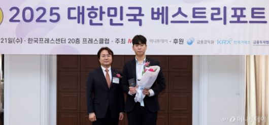 21일 서울 중구 프레스센터에서 열린 '2025 대한민국 베스트리포트' 시상식에서 천성대 금융투자협회 본부장(왼쪽)이 이달의 베스트리포트 7월 부문을 수상한 김종배 현대차증권 연구원과 기념촬영을 하고 있다. 김창현 기자 chmt@mt.co.kr Copyright ⓒ 머니투데이 & mt.co.kr. 무단 전재 및 재배포, AI학습 이용 금지.