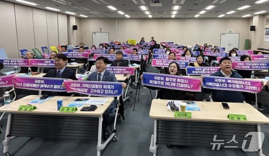 21일 강연회에 앞서 참석자들이 가덕신공항 계획변경을 촉구하는 퍼포먼스를 하고 있다. 2026.01.21/뉴스1 ⓒ News1 홍윤 기자 |