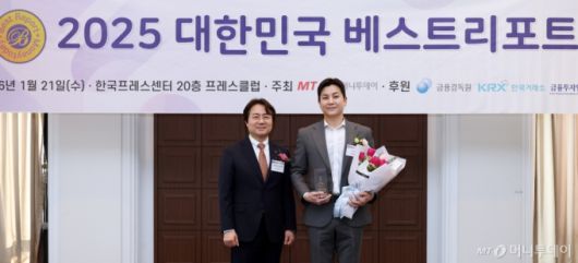 21일 서울 중구 프레스센터에서 열린 '2025 대한민국 베스트리포트' 시상식에서 천성대 금융투자협회 본부장(왼쪽)이 이달의 베스트리포트 9월 부문을 수상한 이동주 SK증권 연구원과 기념촬영을 하고 있다. 김창현 기자 chmt@mt.co.kr Copyright ⓒ 머니투데이 & mt.co.kr. 무단 전재 및 재배포, AI학습 이용 금지.