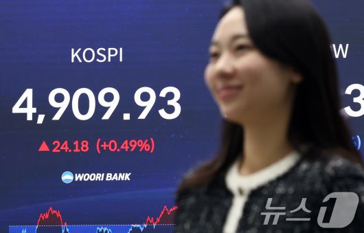 (서울=뉴스1) 최지환 기자 = 21일 오후 서울 중구 우리은행 본점 딜링룸 전광판에 코스피 지수가 표시되어 있다. 이날 코스피는 전 거래일 대비 24.18p(0.49%) 상승한 4909.93, 코스닥은 25.08p(2.57%) 하락한 951.29에 장을 마쳤다. 2026.1.21/뉴스1