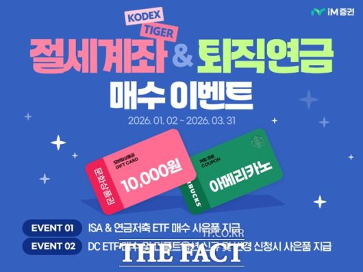 이벤트 기간 내 iM증권의 ISA, 연금저축 등 절세계좌를 보유하고 있는 고객이 대상이다. KODEX(삼성자산운용) 및 TIGER(미래에셋자산운용) ETF 매수 시 선착순으로 사은품을 지급한다.