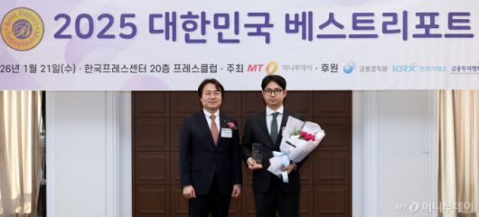 21일 서울 중구 프레스센터에서 열린 '2025 대한민국 베스트리포트' 시상식에서 천성대 금융투자협회 본부장(왼쪽)이 이달의 베스트리포트 11월 부문을 수상한 박찬솔 하나증권 연구원과 기념촬영을 하고 있다. 김창현 기자 chmt@mt.co.kr Copyright ⓒ 머니투데이 & mt.co.kr. 무단 전재 및 재배포, AI학습 이용 금지.