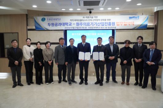 강건용 두원공과대학교 총장은 “교육과 연구 성과가 산업 현장에서 바로 쓰이도록 협력 구조를 강화해 바이오·의료기기 분야 실무형 인재를 체계적으로 키우겠다”고 강조했다. 이에 황동훈 원주의료기기산업진흥원 원장 직무대행은 “기술 검증과 실증 지원을 대학과 유기적으로 연계해 의료기기 산업의 성장 경로를 넓히고 현장에서 체감하는 성과를 내겠다”고 화답했다.