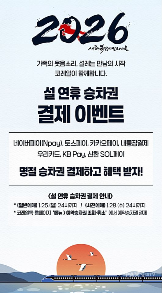 이와 함께 코레일은 설 연휴 승차권 예매 고객에게 감사하는 마음을 전하기 위해 2억 원 상당의 페이백·할인 이벤트를 진행합니다.
