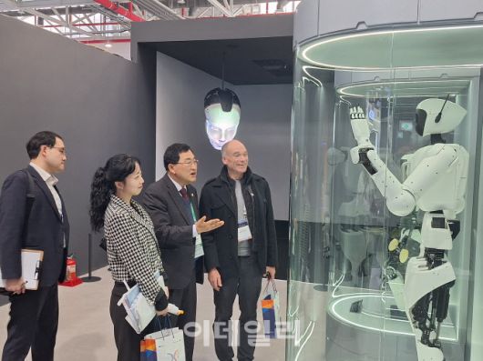 주낙영(왼쪽 세번째) 경주시장이 해외 관계자들과 함께 첨단 로봇 기술이 적용된 전시 제품을 살펴보며 설명을 듣고 있다.(사진=경주시) |