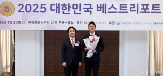21일 서울 중구 프레스센터에서 열린 '2025 대한민국 베스트리포트' 시상식에서 천성대 금융투자협회 본부장(왼쪽)이 이달의 베스트리포트 12월 부문을 수상한 고영민 다올투자증권 연구원과 기념촬영을 하고 있다. 김창현 기자 chmt@mt.co.kr Copyright ⓒ 머니투데이 & mt.co.kr. 무단 전재 및 재배포, AI학습 이용 금지.