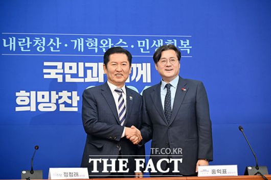 이날 정 대표는 "즉각 가동 가능한 정무수석을 임명해 준 것에 대해 이재명 대통령에게 감사하다"며 홍 수석에게 환영 인사를 전했다.