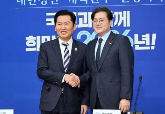 홍익표 대통령실 정무수석(오른쪽)이 21일 국회에서 정청래 더불어민주당 대표를 예방하고 있다.