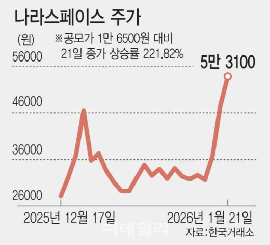 [이데일리 신하연 기자] 초소형 위성 전문기업 나라스페이스테크놀로지(478340)가 코스닥 상장 한 달여 만에 주가가 세 배 넘게 급등했다. 우주항공주 전반에 부는 훈풍에 개별 모멘텀까지 반영되면서 매수세가 몰린 것으로 풀이된다.