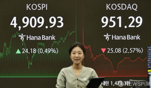 한국거래소에 따르면 이날 코스피는 전 거래일 대비 24.18포인트(0.49%) 상승한 4909.93에 마감했다. 외국인과 기관이 각각 4393억원, 3217억원을 순매수한 가운데, 개인이 9963억원을 순매도했다.