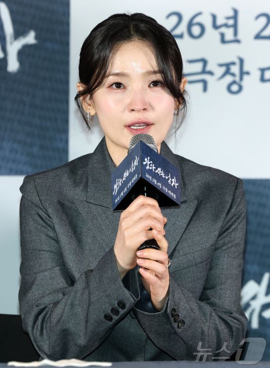 (서울=뉴스1) 김진환 기자 = 배우 전미도가 21일 오후 서울 강남구 코엑스 메가박스점에서 열린 영화 ‘왕과 사는 남자’ 기자간담회에서 인사말을 하고 있다. '왕과 사는 남자'는 1457년 청령포, 마을의 부흥을 위해 유배지를 자처한 촌장과 왕위에서 쫓겨나 유배된 어린 선왕의 이야기로, 내달 4일 개봉한다. 2026.1.21/뉴스1
