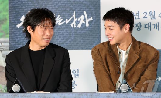 (서울=뉴스1) 김진환 기자 = 배우 유해진과 박지훈(오른쪽)이 21일 오후 서울 강남구 코엑스 메가박스점에서 열린 영화 ‘왕과 사는 남자’ 기자간담회에서 웃으며 대화를 나누고 있다. '왕과 사는 남자'는 1457년 청령포, 마을의 부흥을 위해 유배지를 자처한 촌장과 왕위에서 쫓겨나 유배된 어린 선왕의 이야기로, 내달 4일 개봉한다. 2026.1.21/뉴스1