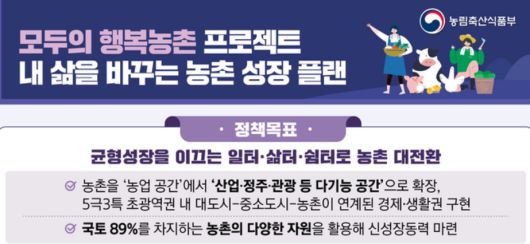 농림축산식품부는 주거환경 개선과 축산·융복합산업 집적화 등 주민이 체감할 수 있는 공간정책 성과를 연내에 내는 것을 목표로 제시했다. 139개 시·군이 농촌공간계획 수립을 마치고, 각각의 농촌특화지구 발굴·육성에 나서도록 지원한다는 방침이다.