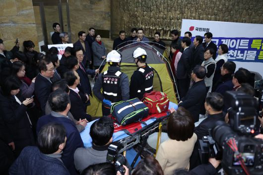 장동혁 국민의힘 대표 단식 7일차인 21일 오후 단식장인 서울 여의도 국회 로텐더홀에 119소방대원이 출동해 병원 이송을 준비하고 있다. /뉴스1 |