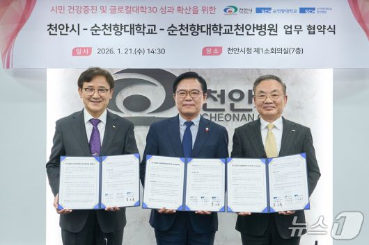 천안시는 21일 시청 제1소회의실에서 순천향대학교, 순천향대학교 부속 천안병원과 '노인 건강증진 및 글로컬대학30 성과 확산을 위한 업무협약'을 체결했다.