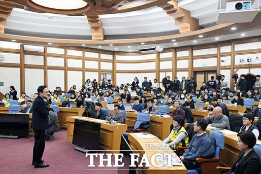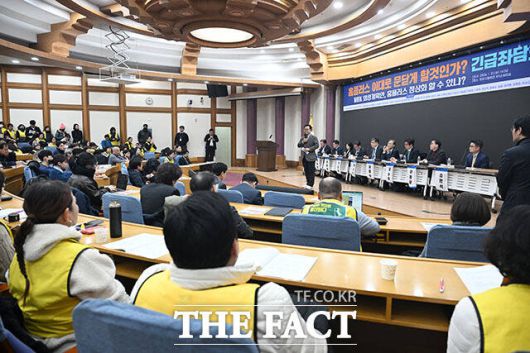 [더팩트ㅣ국회=남용희 기자] 마트산업 노조 홈플러스 지부 노조원과 참석자들이 21일 오후 서울 여의도 국회 의원회관에서 열린 '홈플러스, 이대로 문닫게 할 것인가' 긴급 좌담회에 참석해 있다.