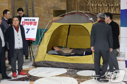 (서울=뉴스1) 이승배 기자 = 장동혁 국민의힘 대표가 21일 서울 여의도 국회 로텐더홀에서 더불어민주당의 통일교 및 공천뇌물 특검 수용을 촉구하며 7일째 단식을 이어가고 있다. 소방 구급대원들이 장 대표의 병원 이송을 위해 단식장에 출동했으나 이송 거부로 돌아갔다. 2026.1.21/뉴스1