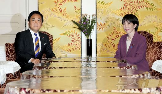 다카이치 사나에 일본 자민당 총재(오른쪽)와 다마키 유이치로 국민민주당 대표가 15일 일본 도쿄 국회의사당에서 만나 대화하고 있다. 2025.10.15 ⓒ 로이터=뉴스1 |