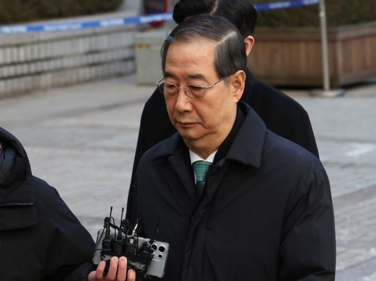 내란 중요임무 종사, 내란 우두머리 방조 등 혐의를 받는 한덕수 전 국무총리가 21일 오후 서울 서초구 서울중앙지법에서 열린 1심 선고 공판에 출석하고 있다. 최현수 기자 emd@hani.co.kr |