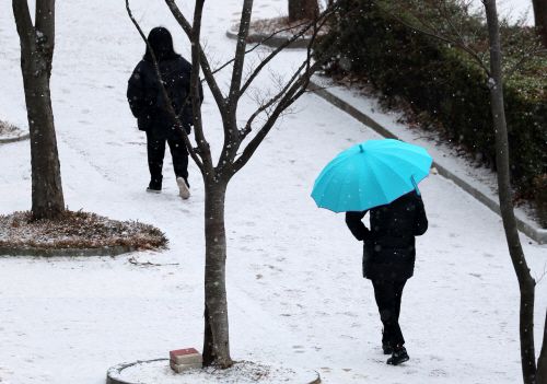 21일 광주 서구 치평동에서 시민들이 눈이 내리고 있는 거리를 걷고 있다. /연합뉴스 |