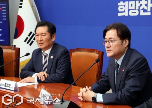 (서울=국제뉴스) 홍익표 대통령비서실 정무수석이 21일 오후 서울 여의도 국회에서 정청래 더불어민주당 대표를 예방하며 인사말을 하고 있다./사진=이용우 기자