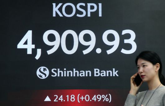 21일 한국거래소에 따르면 이날 코스피는 전장보다 0.49%(24.18포인트) 오른 4909.03에 거래를 마쳤다. 이는 종가 기준 사상 최고치다.