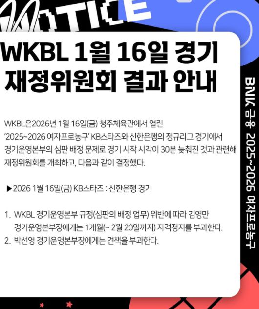 WKBL은 21일 "지난 16일 청주체육관에서 열린 2025-26시즌 여자프로농구 KB스타즈와 신한은행의 정규리그 경기에서 경기운영본부의 심판 배정 문제로 경기 시작 시각이 30분 늦춰진 것에 대해 김영만 경기운영본부장에게 1개월 자격정지를 부과한다"고 전했다. 아울러 박선영 경기운영부장도 견책을 부과받았다.